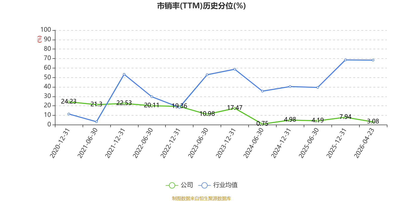 以4月23日收盘价计算,苏豪汇鸿目前市盈率(TTM)约为-1871.4倍,市净率(LF)约1.3倍,市销率(TTM)约0.11倍。