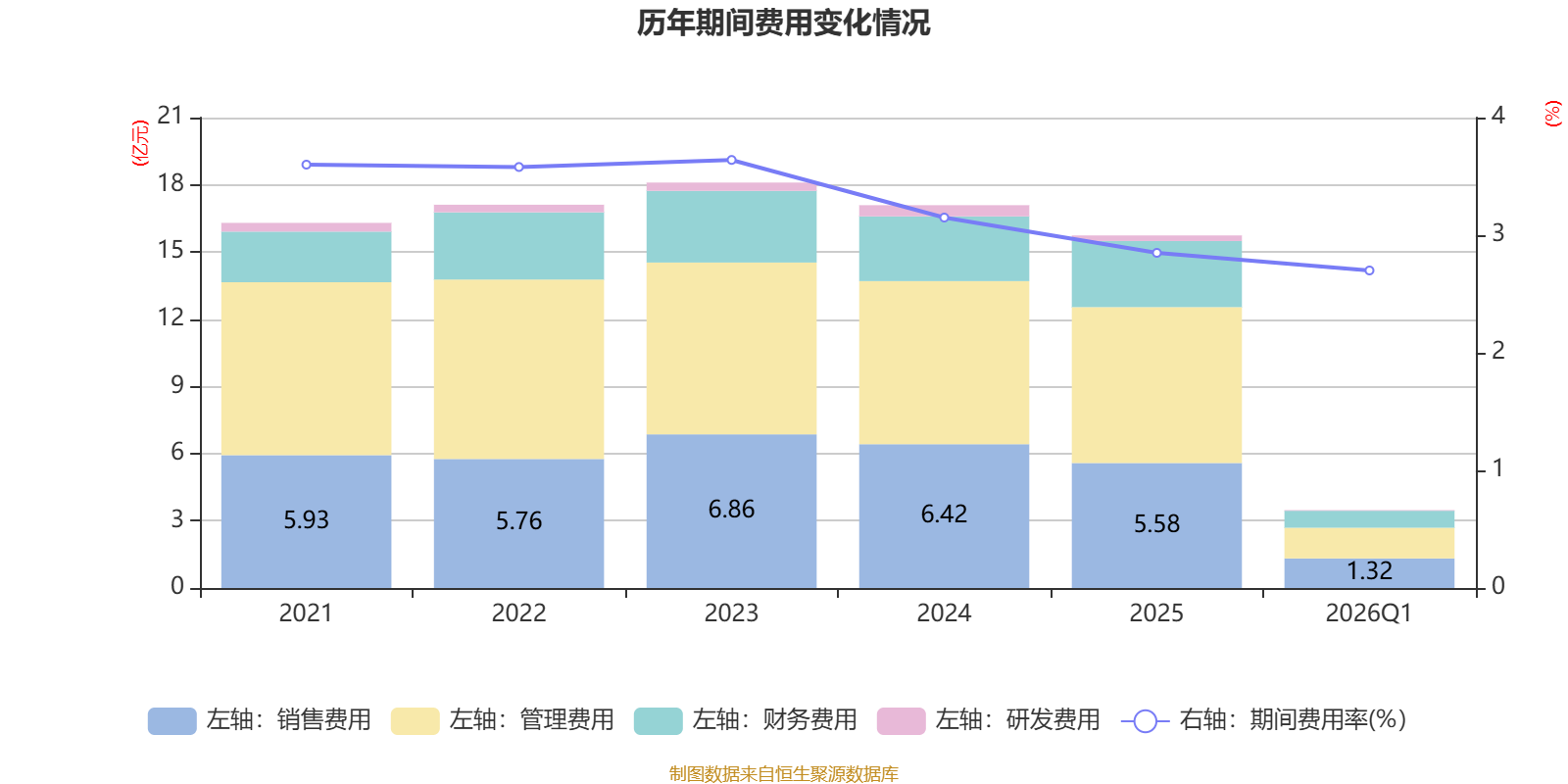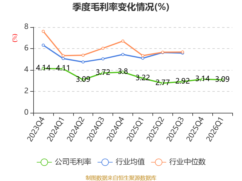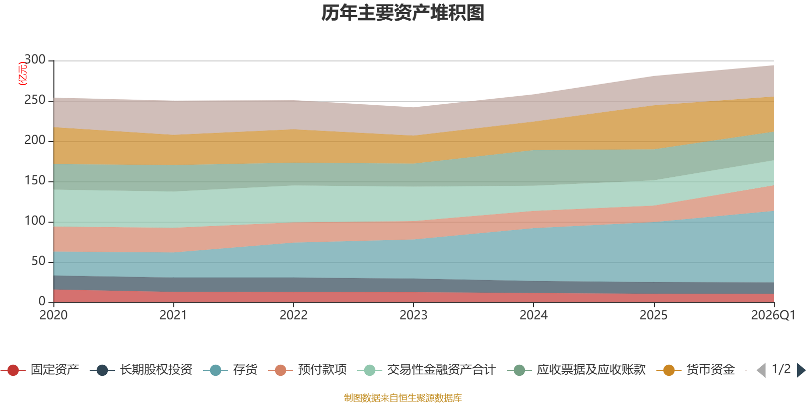 资产重大变化方面,截至2026年一季度末,公司货币资金较上年末减少20.1%,占公司总资产比重下降4.6个百分点;存货较上年末增加18.86%,占公司总资产比重上升3.58个百分点;预付款项较上年末增加54.72%,占公司总资产比重上升3.49个百分点;应收票据及应收账款较上年末减少8%,占公司总资产比重下降1.67个百分点。