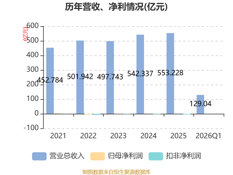 中证智能财讯苏豪汇鸿(600981)4月24日披露2026年第一季度报告。公司实现营业总收入129.04亿元,同比增长16.40%;归母净利润亏损3295.56万元,上年同期亏损1367.3万元;扣非净利润亏损628.88万元,上年同期亏损3391.92万元;经营活动产生的现金流量净额为-10.75亿元,上年同期为-3.85亿元;报告期内,苏豪汇鸿基本每股收益为-0.01元,加权平均净资产收益率为-0.66%。