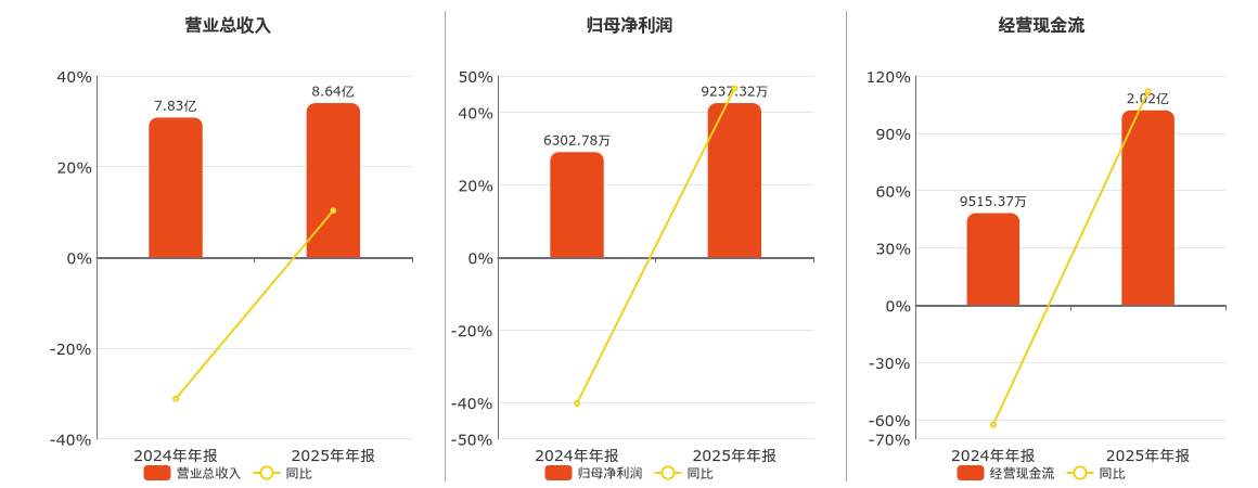 公司营业总收入为8.64亿元,在已披露的同业公司中排名第130。归母净利润为9237.32万元,在已披露的同业公司中排名第114。经营活动现金净流入为2.02亿元,在已披露的同业公司中排名第89。