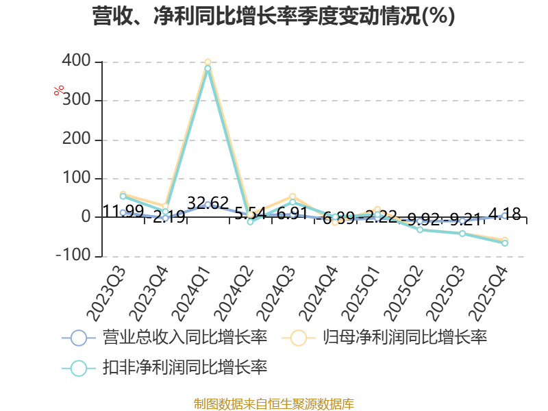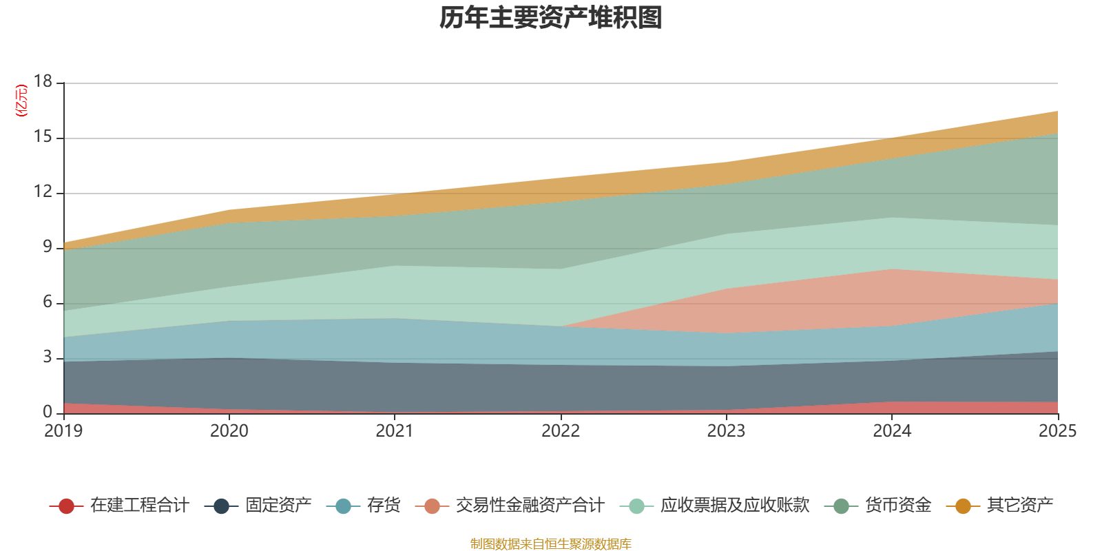 资产重大变化方面,截至2025年末,公司交易性金融资产合计较上年末减少57.9%,占公司总资产比重下降12.75个百分点;货币资金较上年末增加55.71%,占公司总资产比重上升8.97个百分点;存货较上年末增加37.96%,占公司总资产比重上升3.25个百分点;固定资产较上年末增加23.74%,占公司总资产比重上升1.89个百分点。