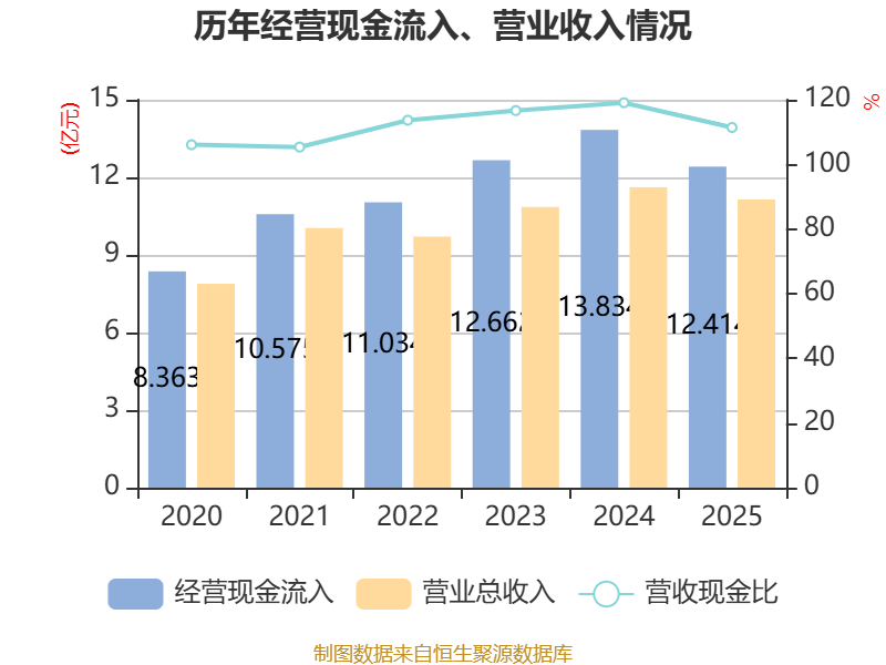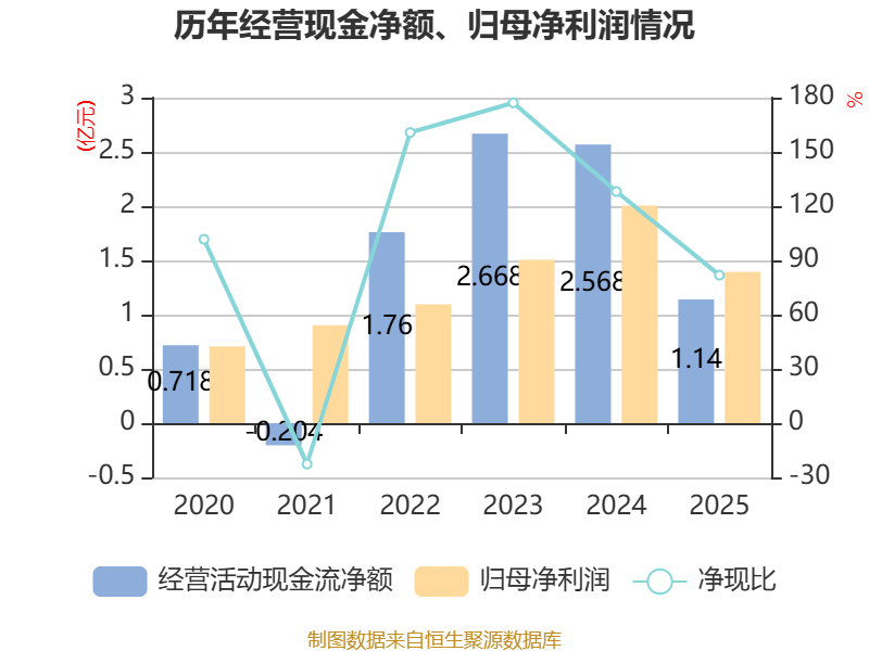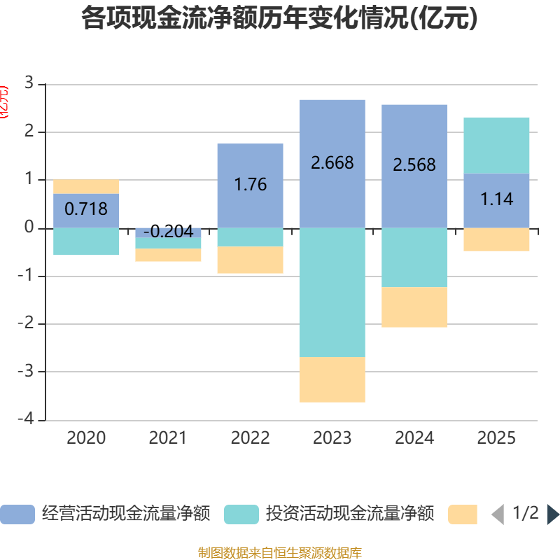 截至2025年,公司经营活动现金流净额为1.14亿元,同比下降55.6%;筹资活动现金流净额-4824.17万元,同比增加3536.28万元;投资活动现金流净额1.16亿元,上年同期为-1.23亿元。