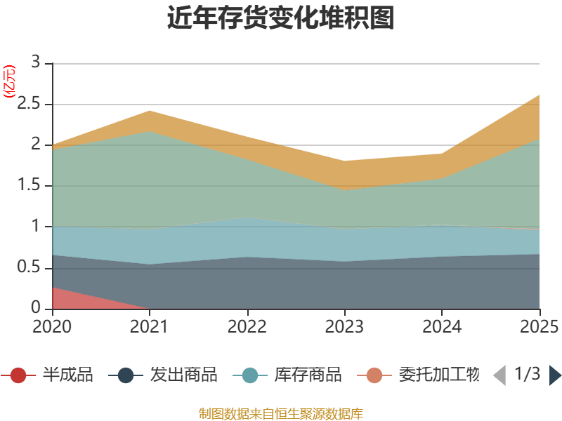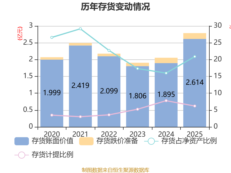 从存货变动来看,截至2025年末,公司存货账面价值为2.61亿元,占净资产的20.9%,较上年末增加7191.95万元。其中,存货跌价准备为1728.49万元,计提比例为6.2%。
