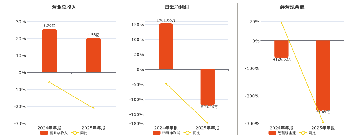 公司营业总收入为4.56亿元,较去年同报告期营业总收入减少1.23亿元,同比较去年同期下降21.23%。归母净利润为-1503.86万元,较去年同报告期归母净利润减少3385.49万元,同比较去年同期下降179.92%。经营活动现金净流入为-1.64亿元,较去年同报告期经营活动现金净流入减少1.23亿元。