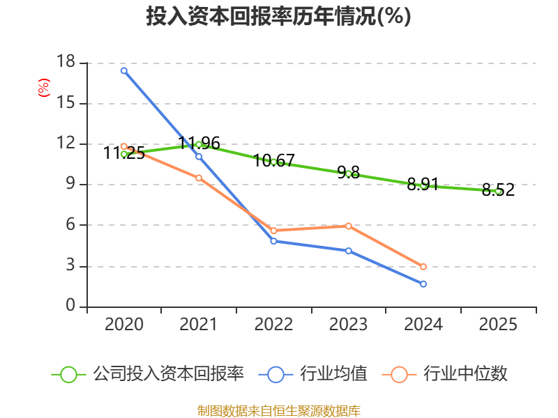 数据显示,2025年公司加权平均净资产收益率为9.74%,较上年同期上升0.91个百分点。公司2025年投入资本回报率为8.52%,较上年同期下降0.39个百分点。