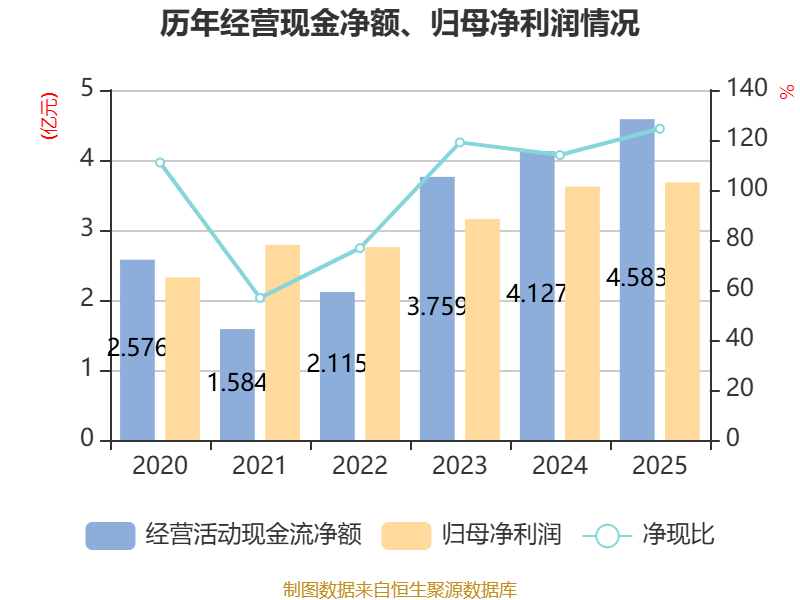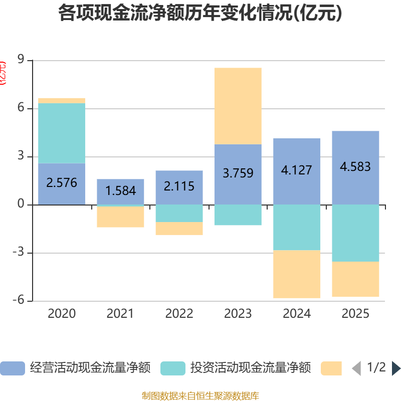 截至2025年,公司经营活动现金流净额为4.58亿元,同比增长11.05%;筹资活动现金流净额-2.19亿元,同比增加7916.94万元;投资活动现金流净额-3.56亿元,上年同期为-2.86亿元。