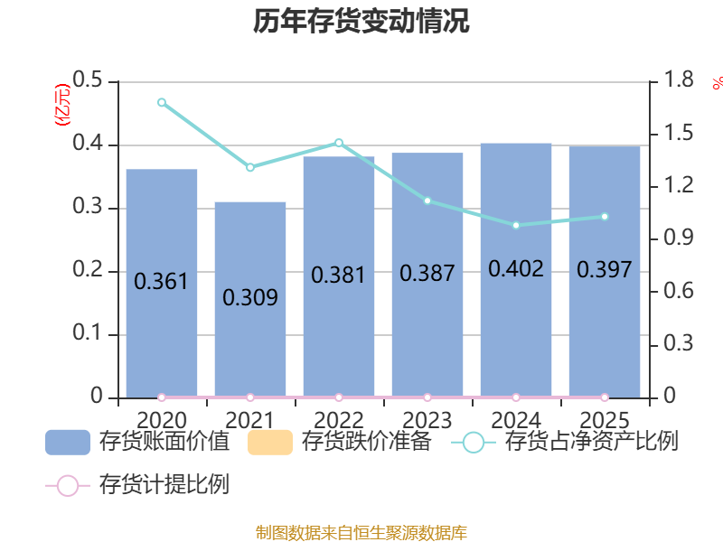 从存货变动来看,截至2025年末,公司存货账面价值为3968.53万元,占净资产的1.03%,较上年末减少54.45万元。公司本期没有计提存货跌价准备。