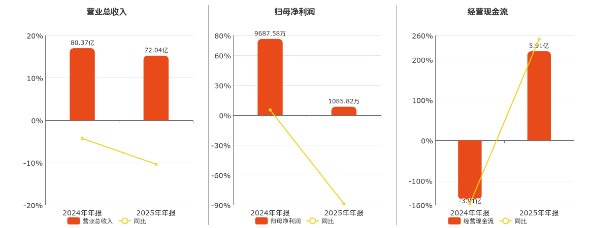 公司营业总收入为72.04亿元,在已披露的同业公司中排名第16,较去年同报告期营业总收入减少8.33亿元,同比较去年同期下降10.37%。归母净利润为1085.82万元,在已披露的同业公司中排名第104,较去年同报告期归母净利润减少8601.76万元,同比较去年同期下降88.79%。经营活动现金净流入为5.91亿元,在已披露的同业公司中排名第18,较去年同报告期经营活动现金净流入增加9.82亿元。