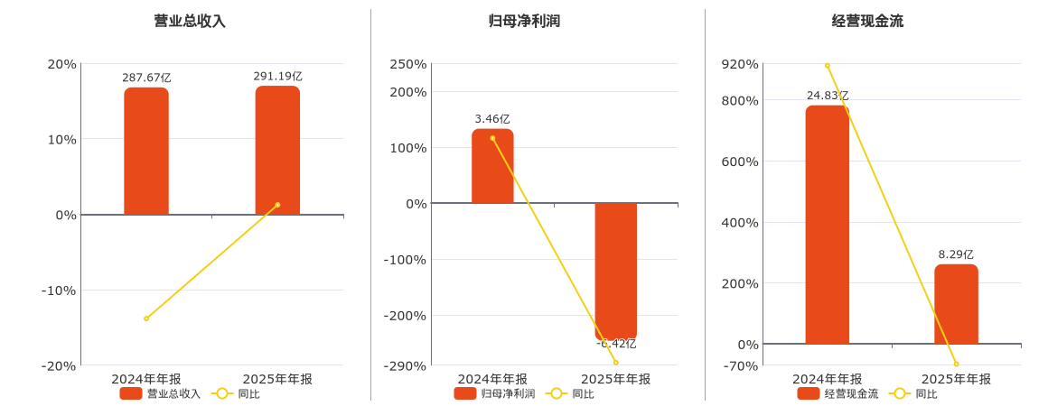 公司营业总收入为291.19亿元。归母净利润为-6.42亿元,较去年同报告期归母净利润减少9.87亿元,同比较去年同期下降285.53%。经营活动现金净流入为8.29亿元,较去年同报告期经营活动现金净流入减少16.54亿元,同比较去年同期下降66.62%。