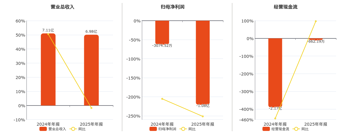 公司营业总收入为6.98亿元,较去年同报告期营业总收入减少1276.15万元,同比较去年同期下降1.79%。归母净利润为-1.08亿元,较去年同报告期归母净利润减少7734.37万元。经营活动现金净流入为-662.19万元。