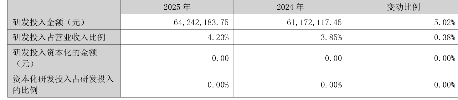 2025年全年,公司研发投入金额为6424.22万元,同比增长5.02%;研发投入占营业收入比例为4.23%,相比上年同期上升0.38个百分点。此外,公司全年研发投入资本化率为0%。