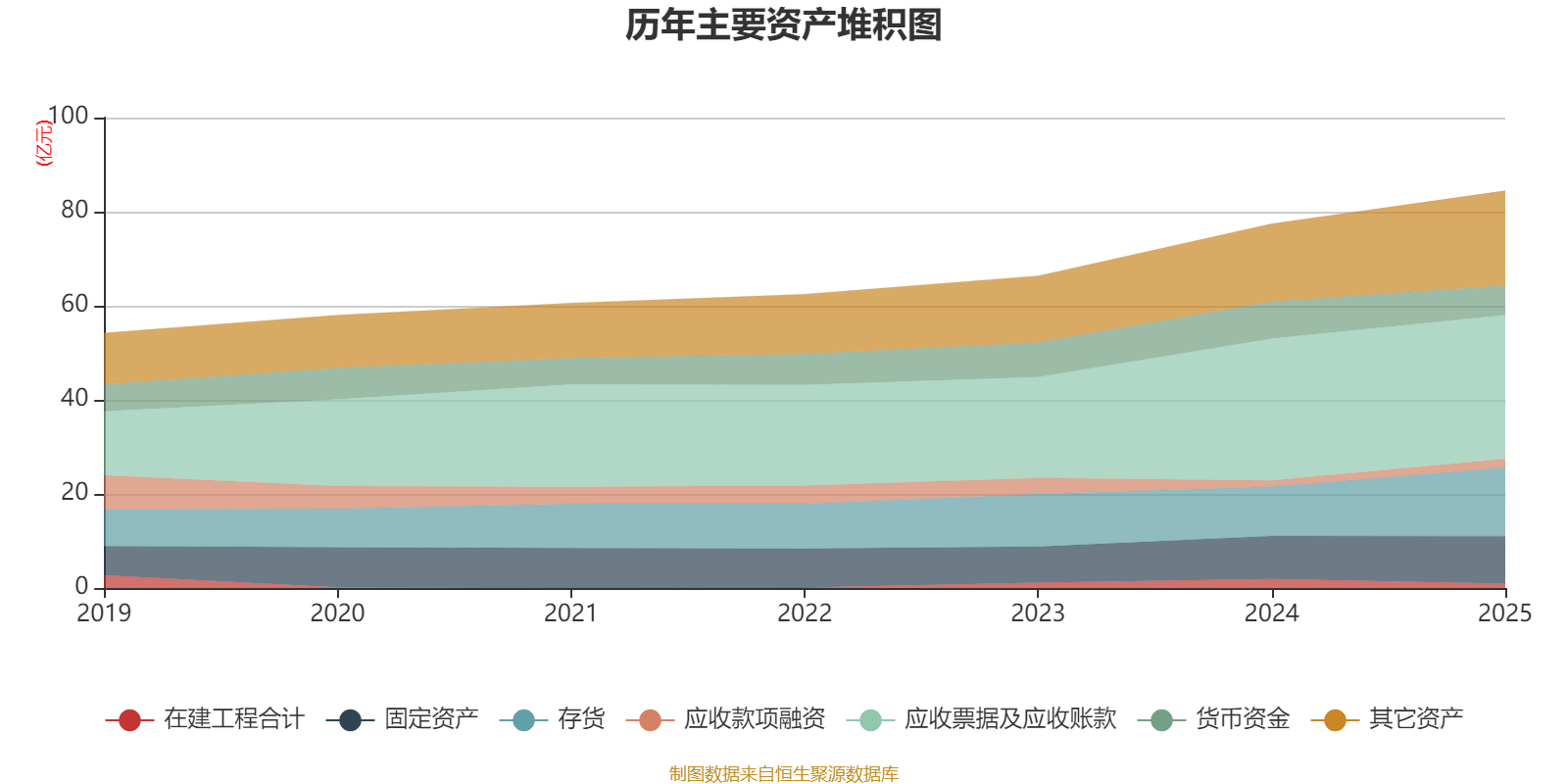 资产重大变化方面,截至2025年末,公司存货较上年末增加39.02%,占公司总资产比重上升3.73个百分点;应收票据及应收账款较上年末增加1.44%,占公司总资产比重下降2.73个百分点;货币资金较上年末减少19.6%,占公司总资产比重下降2.67个百分点;长期应收款较上年末增加62.07%,占公司总资产比重上升1.45个百分点。