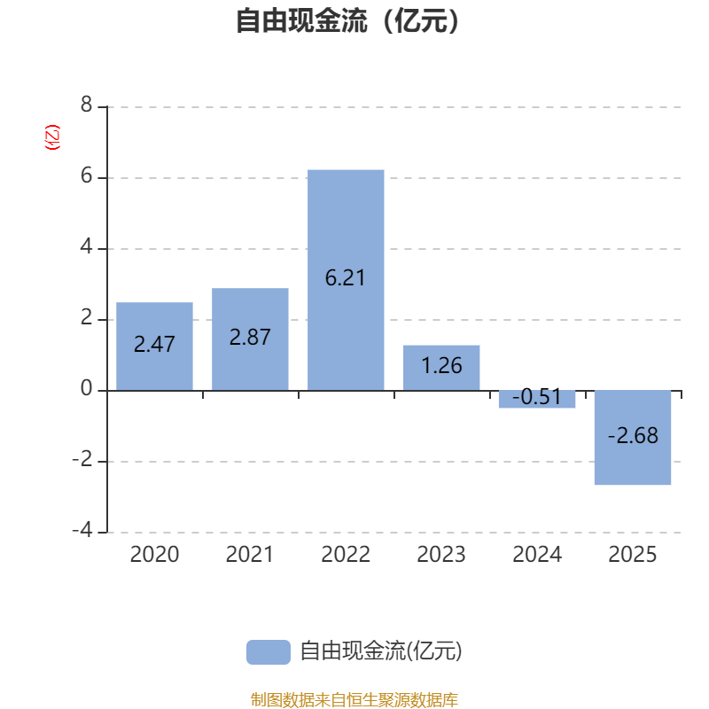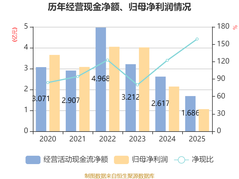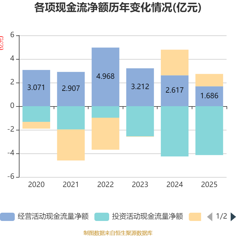 截至2025年,公司经营活动现金流净额为1.69亿元,同比下降35.58%;筹资活动现金流净额1.05亿元,同比减少1.13亿元;投资活动现金流净额-4.14亿元,上年同期为-4.26亿元。