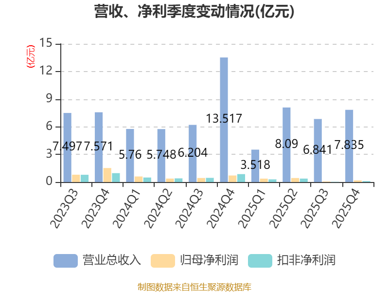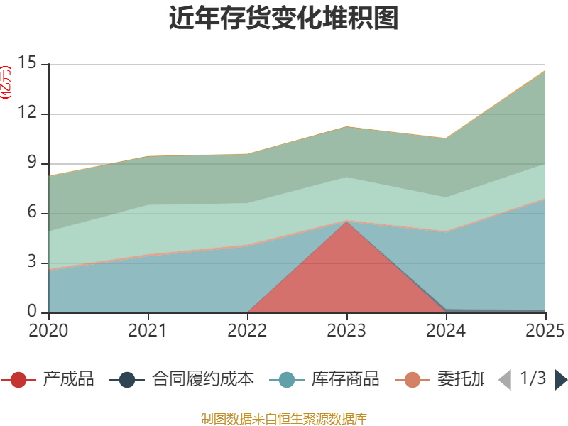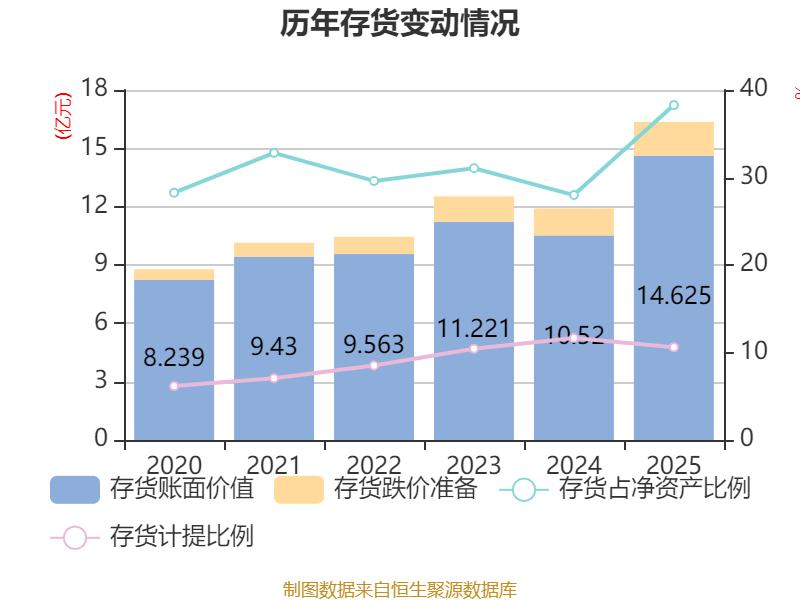 从存货变动来看,截至2025年末,公司存货账面价值为14.62亿元,占净资产的38.28%,较上年末增加4.1亿元。其中,存货跌价准备为1.73亿元,计提比例为10.6%。