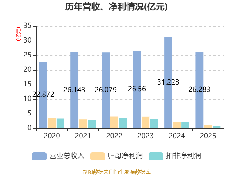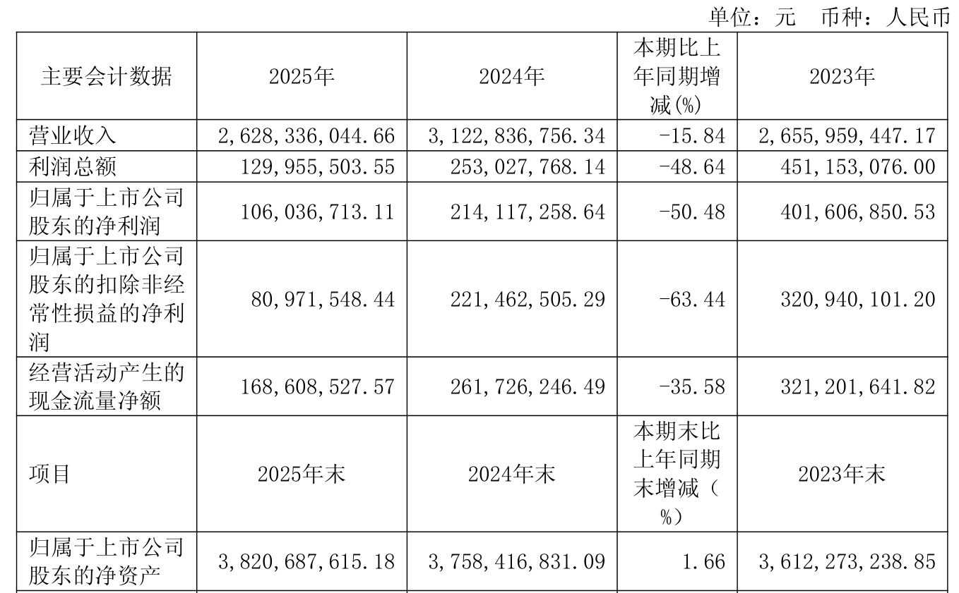 中证智能财讯创力集团(603012)4月24日披露2025年年度报告。2025年,公司实现营业总收入26.28亿元,同比下降15.84%;归母净利润1.06亿元,同比下降50.48%;扣非净利润8097.15万元,同比下降63.44%;经营活动产生的现金流量净额为1.69亿元,同比下降35.58%;报告期内,创力集团基本每股收益为0.16元,加权平均净资产收益率为2.81%。公司2025年度分配预案为:拟向全体股东每10股派现1元(含税)。