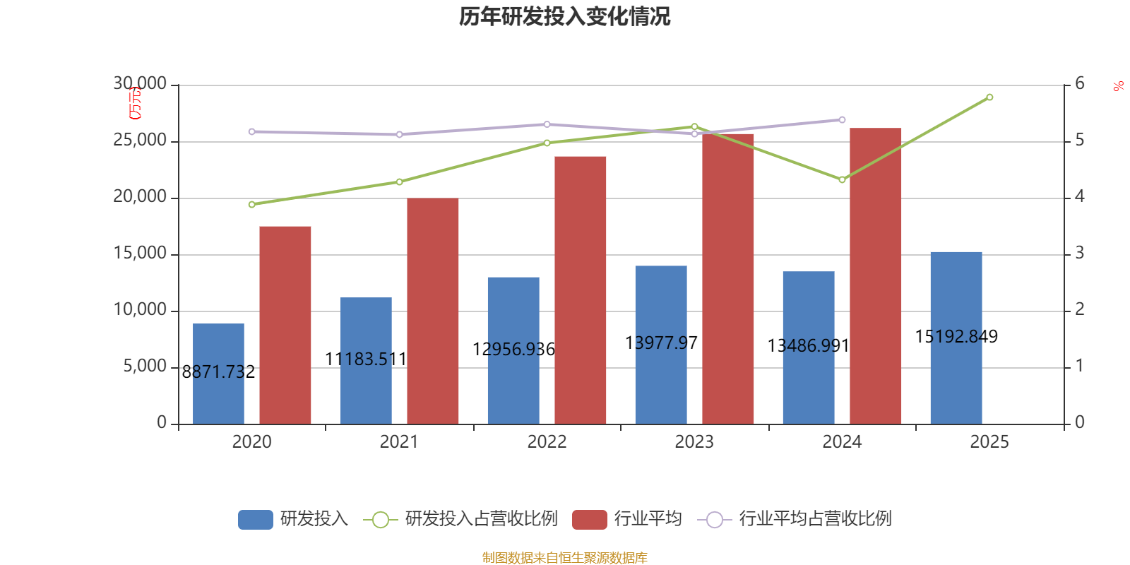 2025年全年,公司研发投入金额为1.52亿元,同比增长12.65%;研发投入占营业收入比例为5.78%,相比上年同期上升1.46个百分点。