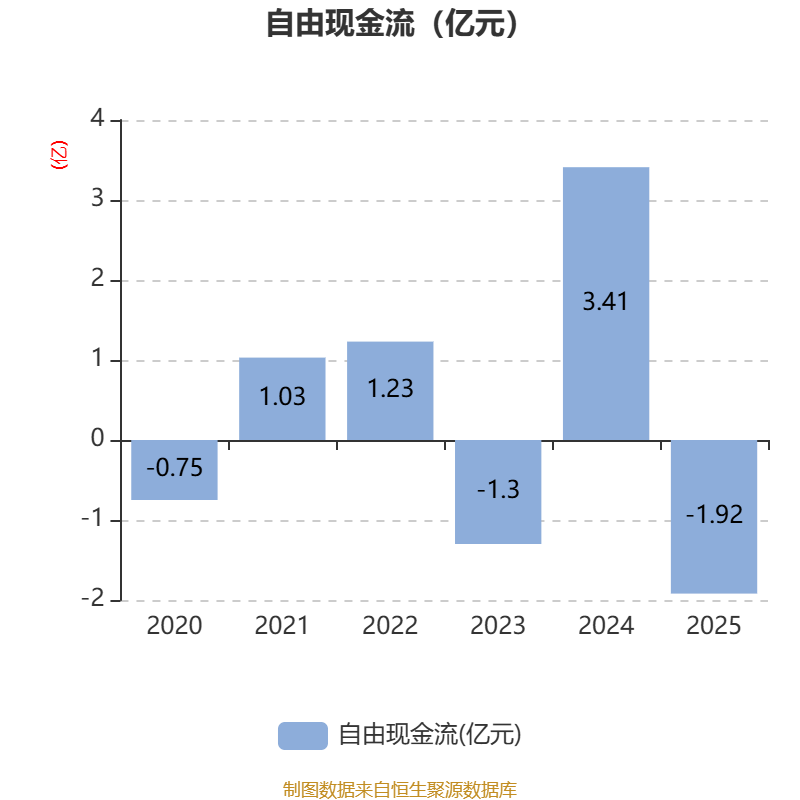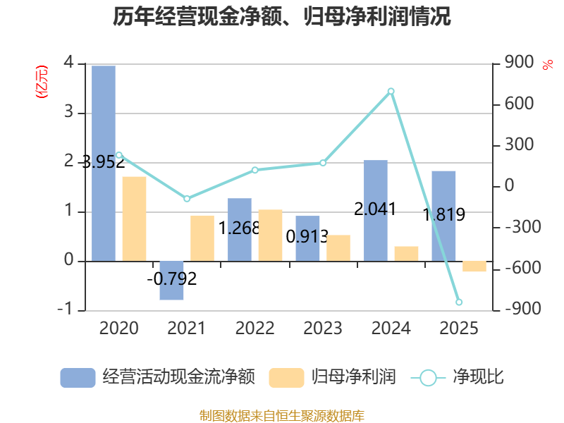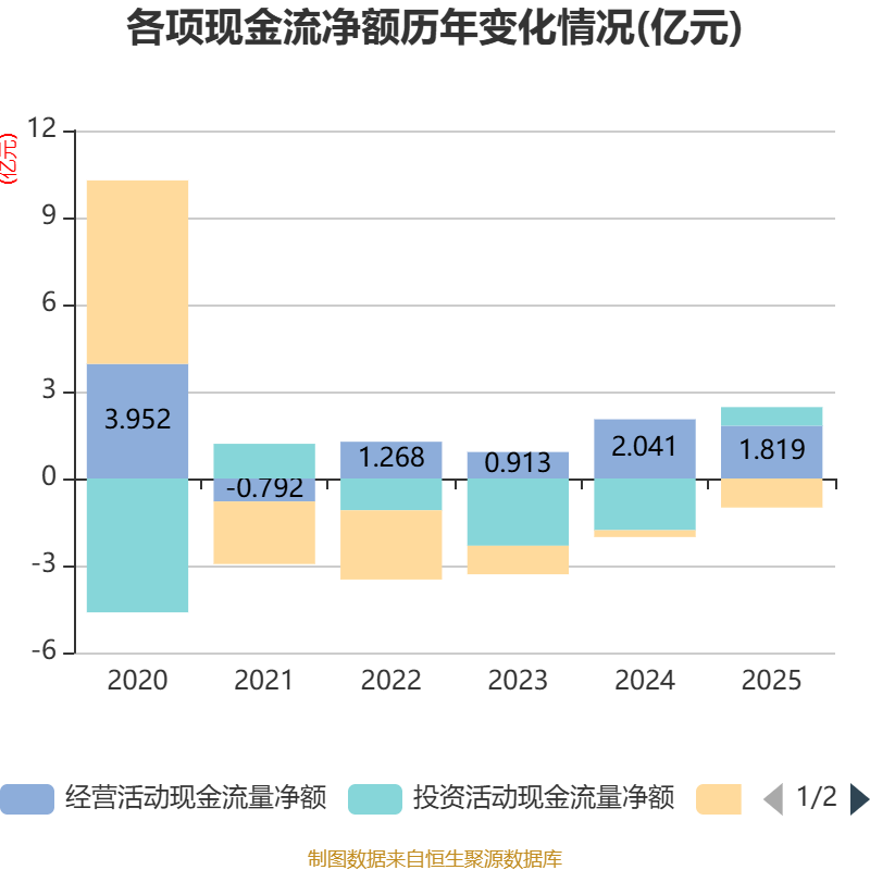 截至2025年,公司经营活动现金流净额为1.82亿元,同比下降10.91%;筹资活动现金流净额-1亿元,同比减少7666.37万元;投资活动现金流净额6430.92万元,上年同期为-1.78亿元。