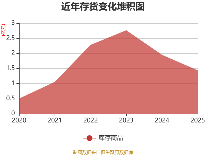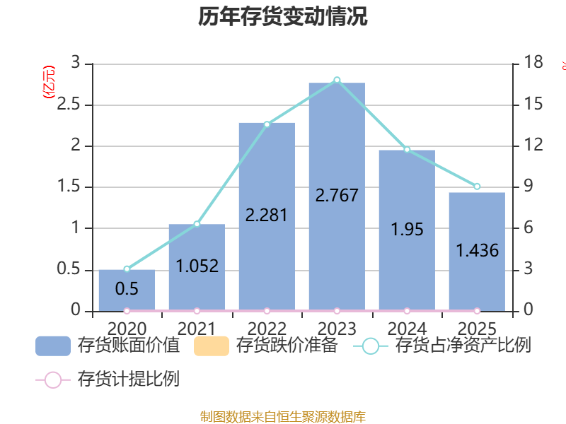 从存货变动来看,截至2025年末,公司存货账面价值为1.44亿元,占净资产的9.06%,较上年末减少5137.54万元。公司本期没有计提存货跌价准备。