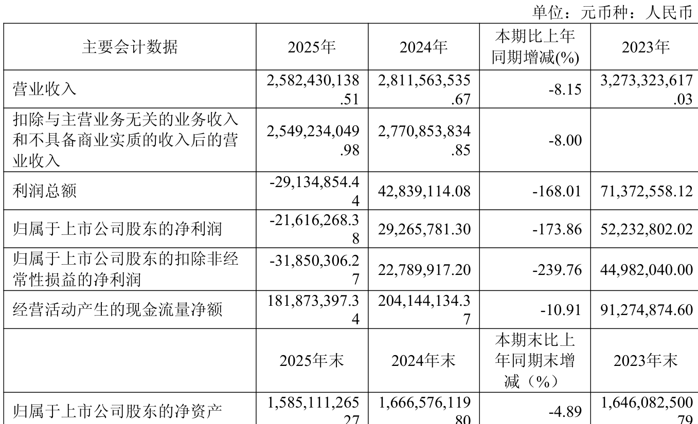 中证智能财讯和顺石油(603353)4月24日披露2025年年度报告。2025年,公司实现营业总收入25.82亿元,同比下降8.15%;归母净利润亏损2161.63万元,上年同期盈利2926.58万元;扣非净利润亏损3185.03万元,上年同期盈利2278.99万元;经营活动产生的现金流量净额为1.82亿元,同比下降10.91%;报告期内,和顺石油基本每股收益为-0.12元,加权平均净资产收益率为-1.31%。公司2025年度分配预案为:拟向全体股东每10股派现1元(含税)。