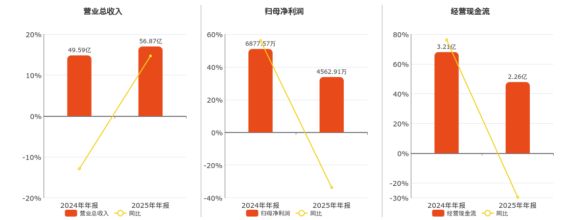公司营业总收入为56.87亿元。归母净利润为4562.91万元,在已披露的同业公司中排名第77,较去年同报告期归母净利润减少2314.66万元,同比较去年同期下降33.66%。经营活动现金净流入为2.26亿元,较去年同报告期经营活动现金净流入减少9511.17万元,同比较去年同期下降29.64%。