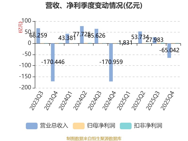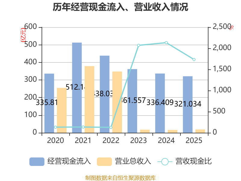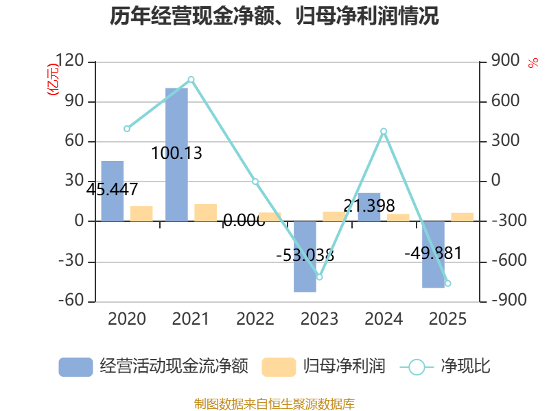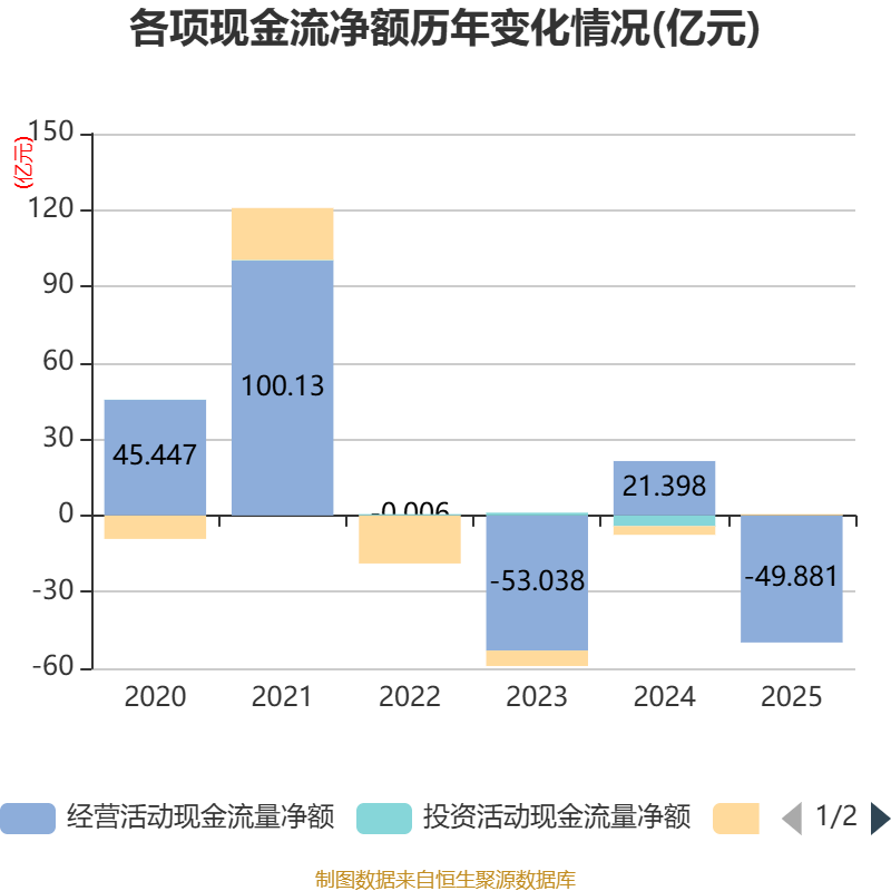 截至2025年,公司经营活动现金流净额为-49.88亿元,同比减少71.28亿元;筹资活动现金流净额4510.8万元,同比增加3.87亿元;投资活动现金流净额591.78万元,上年同期为-4.16亿元。