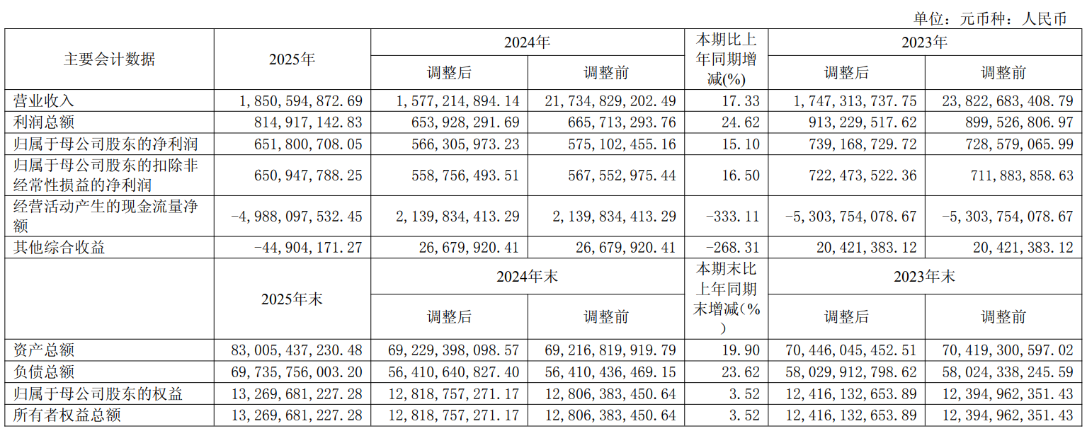 资产重大变化方面,截至2025年末,公司交易性金融资产合计较上年末减少11.95%,占公司总资产比重下降3.59个百分点;货币资金较上年末增加13.15%,占公司总资产比重下降3.02个百分点;其他应收款(含利息和股利)较上年末增加82.11%,占公司总资产比重上升0.65个百分点;债权投资较上年末增加1969.97%,占公司总资产比重上升0.48个百分点。