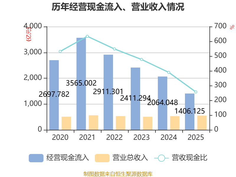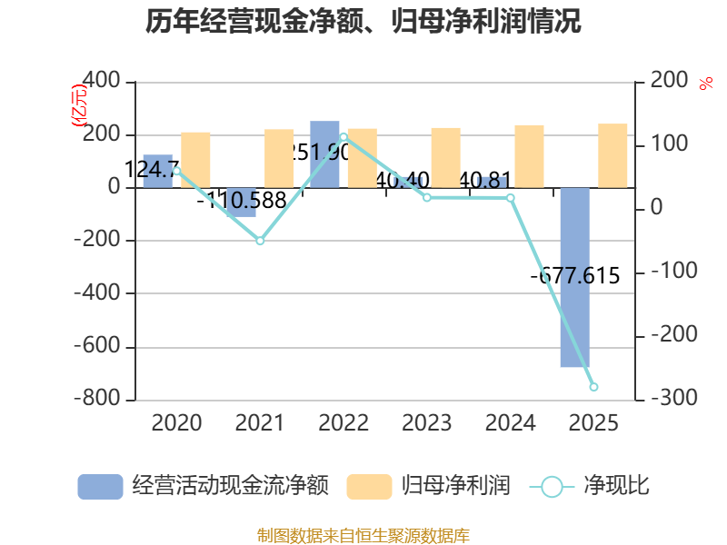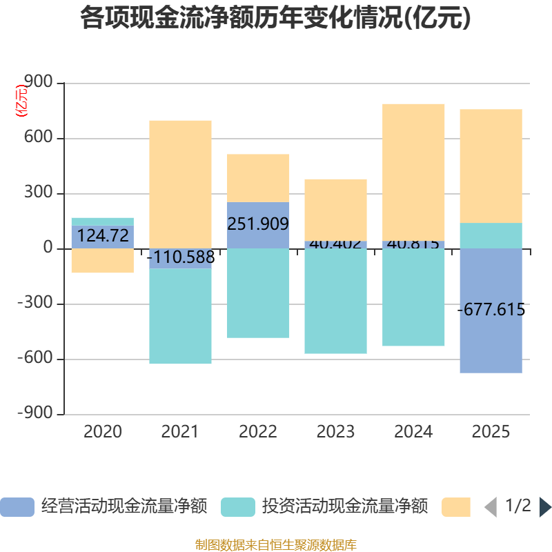 截至2025年,公司经营活动现金流净额为-677.62亿元,同比减少718.43亿元;筹资活动现金流净额617.71亿元,同比减少125.86亿元;投资活动现金流净额138.55亿元,上年同期为-530.11亿元。