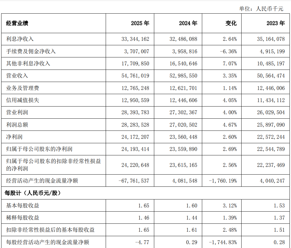 中证智能财讯上海银行(601229)4月24日披露2025年年度报告。2025年,公司实现营业总收入547.61亿元,同比增长3.35%;归母净利润241.93亿元,同比增长2.69%;扣非净利润242.21亿元,同比增长2.56%;经营活动产生的现金流量净额为-677.62亿元,上年同期为40.82亿元;报告期内,上海银行基本每股收益为1.65元,加权平均净资产收益率为9.69%。公司2025年度分配预案为:拟向全体股东每10股派现2.2元(含税)。