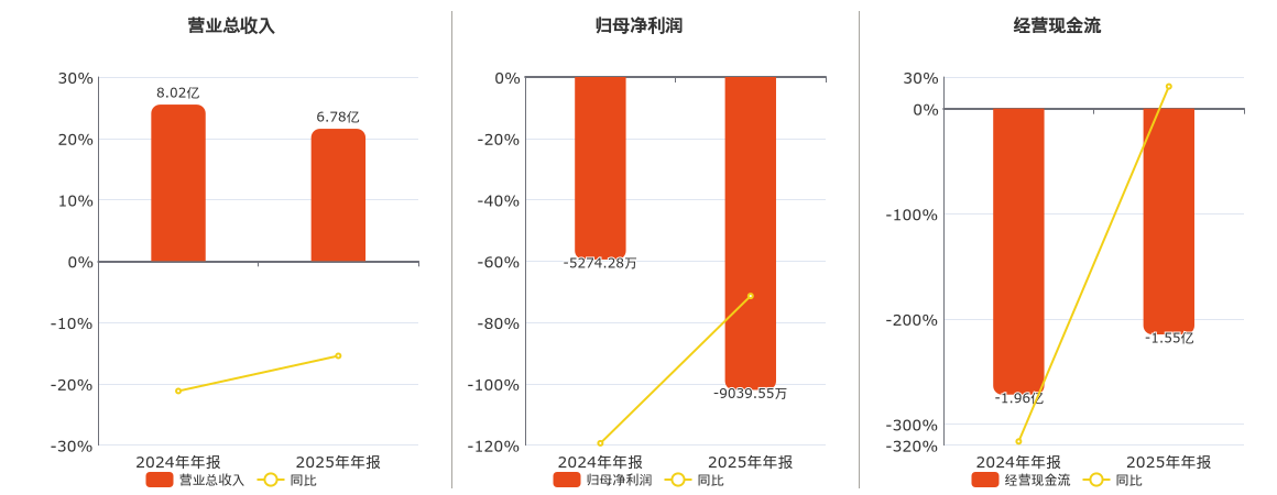 公司营业总收入为6.78亿元,在已披露的同业公司中排名第26,较去年同报告期营业总收入减少1.24亿元,同比较去年同期下降15.45%。归母净利润为-9039.55万元,在已披露的同业公司中排名第27,较去年同报告期归母净利润减少3765.27万元。经营活动现金净流入为-1.55亿元,在已披露的同业公司中排名第31。