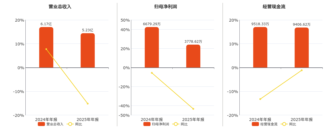公司营业总收入为5.23亿元,在已披露的同业公司中排名第46,较去年同报告期营业总收入减少9366.83万元,同比较去年同期下降15.18%。归母净利润为3778.62万元,在已披露的同业公司中排名第40,较去年同报告期归母净利润减少2900.66万元,同比较去年同期下降43.43%。经营活动现金净流入为9406.62万元,在已披露的同业公司中排名第42,较去年同报告期经营活动现金净流入减少111.72万元,同比较去年同期下降1.17%。