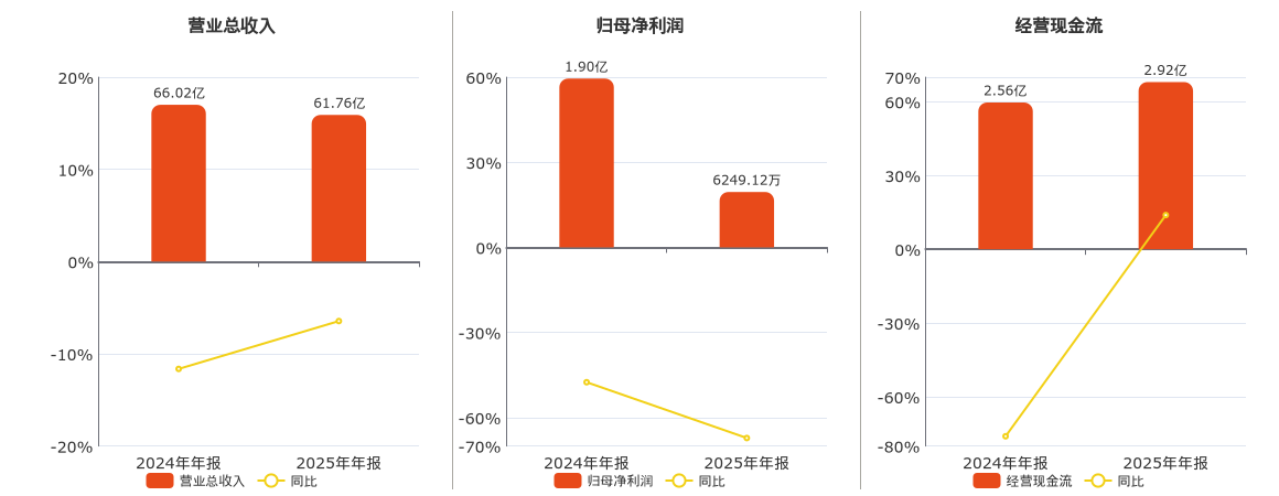 公司营业总收入为61.76亿元,较去年同报告期营业总收入减少4.26亿元,同比较去年同期下降6.45%。归母净利润为6249.12万元,较去年同报告期归母净利润减少1.28亿元,同比较去年同期下降67.19%。经营活动现金净流入为2.92亿元。