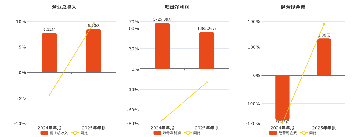 公司营业总收入为6.93亿元,在已披露的同业公司中排名第90。归母净利润为1385.26万元,在已披露的同业公司中排名第91,较去年同报告期归母净利润减少340.63万元,同比较去年同期下降19.74%。经营活动现金净流入为1.08亿元,在已披露的同业公司中排名第72。