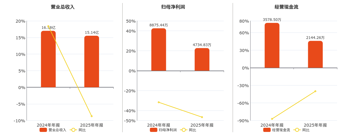 公司营业总收入为15.14亿元,较去年同报告期营业总收入减少1.44亿元,同比较去年同期下降8.71%。归母净利润为4734.83万元,在已披露的同业公司中排名第86,较去年同报告期归母净利润减少4140.61万元,同比较去年同期下降46.65%。经营活动现金净流入为2144.26万元,在已披露的同业公司中排名第97,较去年同报告期经营活动现金净流入减少1434.24万元,同比较去年同期下降40.08%。