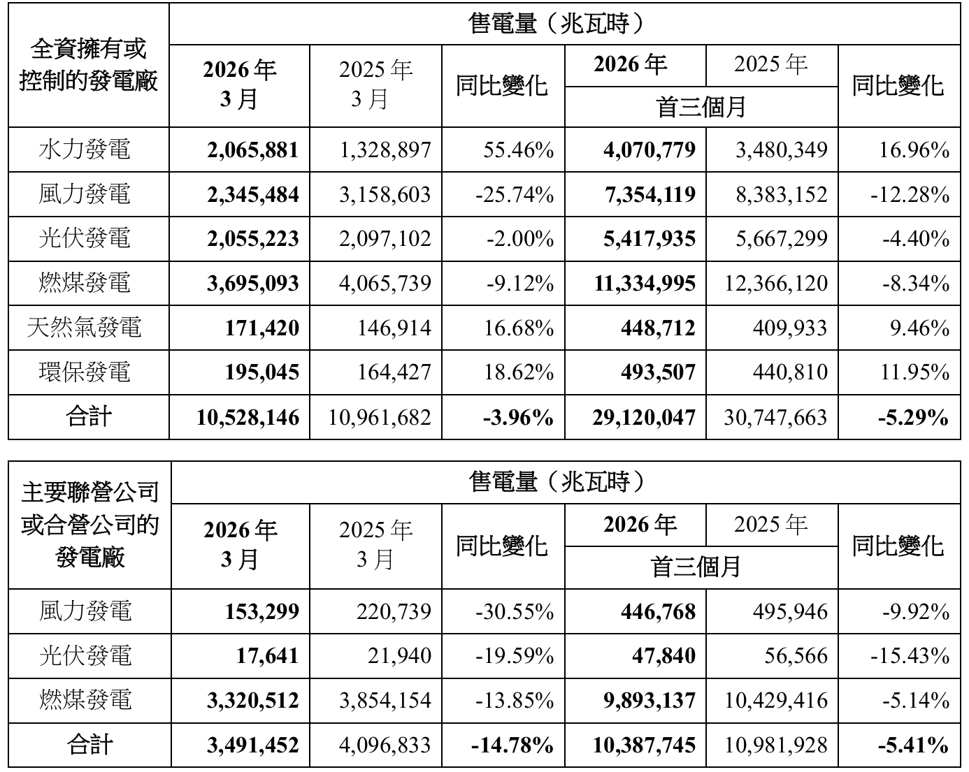 4月24日,中国电力(02380)发布公告,基于初步统计,2026年3月,公司总售电量为1053万兆瓦时,同比下降3.96%。2026年一季度,公司总售电量2912万兆瓦时,同比下降5.29%。具体数据如下: