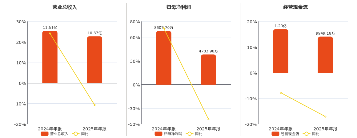 公司营业总收入为10.37亿元,在已披露的同业公司中排名第13,较去年同报告期营业总收入减少1.24亿元,同比较去年同期下降10.68%。归母净利润为4783.98万元,在已披露的同业公司中排名第14,较去年同报告期归母净利润减少3723.72万元,同比较去年同期下降43.77%。经营活动现金净流入为9949.18万元,在已披露的同业公司中排名第12,较去年同报告期经营活动现金净流入减少2047.91万元,同比较去年同期下降17.08%。