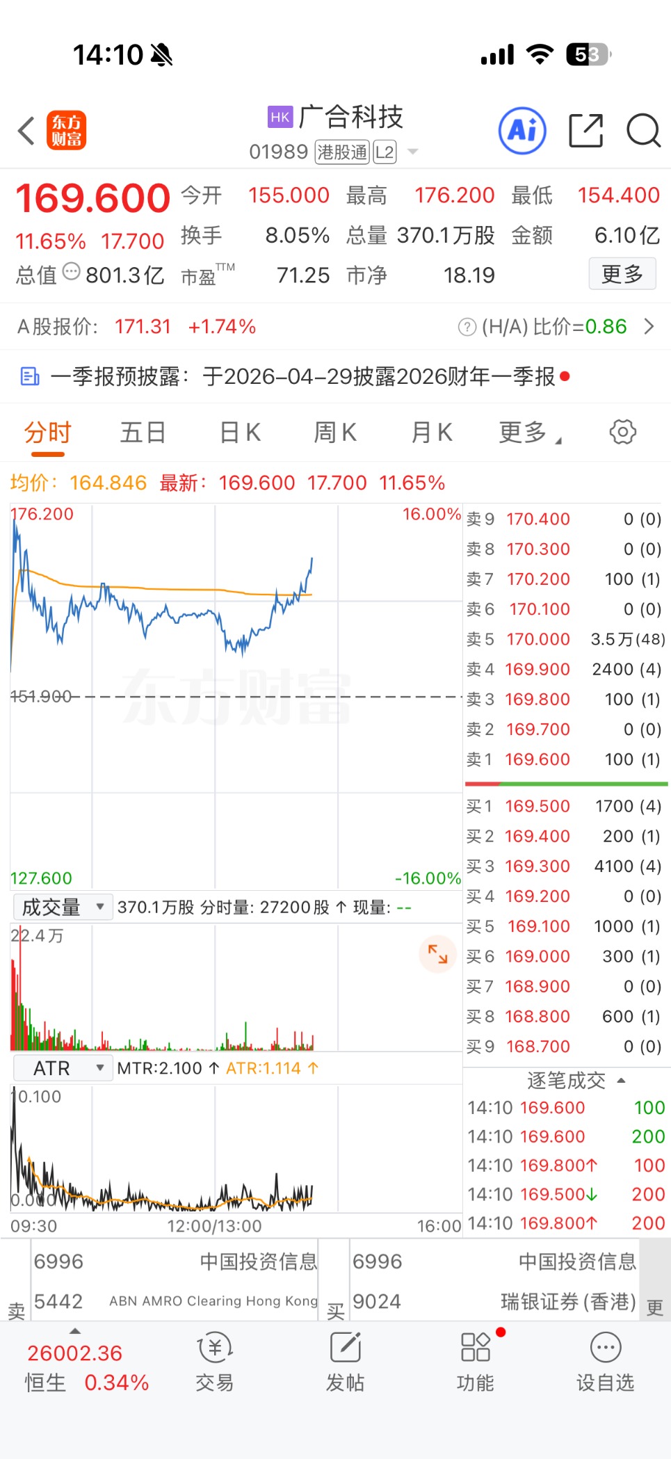 上证报中国证券网讯(记者何治民)4月24日,广合科技H股震荡走强,一度涨超16%,截至14时10分,涨11.65%,报169.60港元/股。