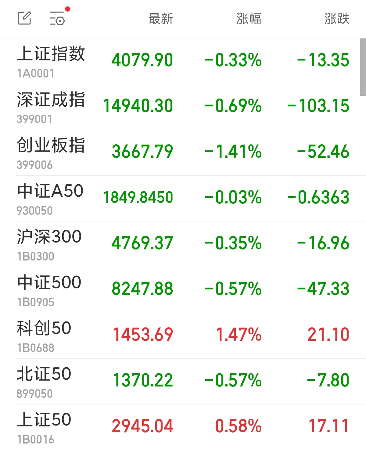 中新经纬4月24日电 周五,A股三大指数集体低开,此后探底回升。截至收盘,上证指数跌0.33%,报4079.90点;深证成指跌0.69%,报14940.30点;创业板指跌1.41%,报3667.79点。