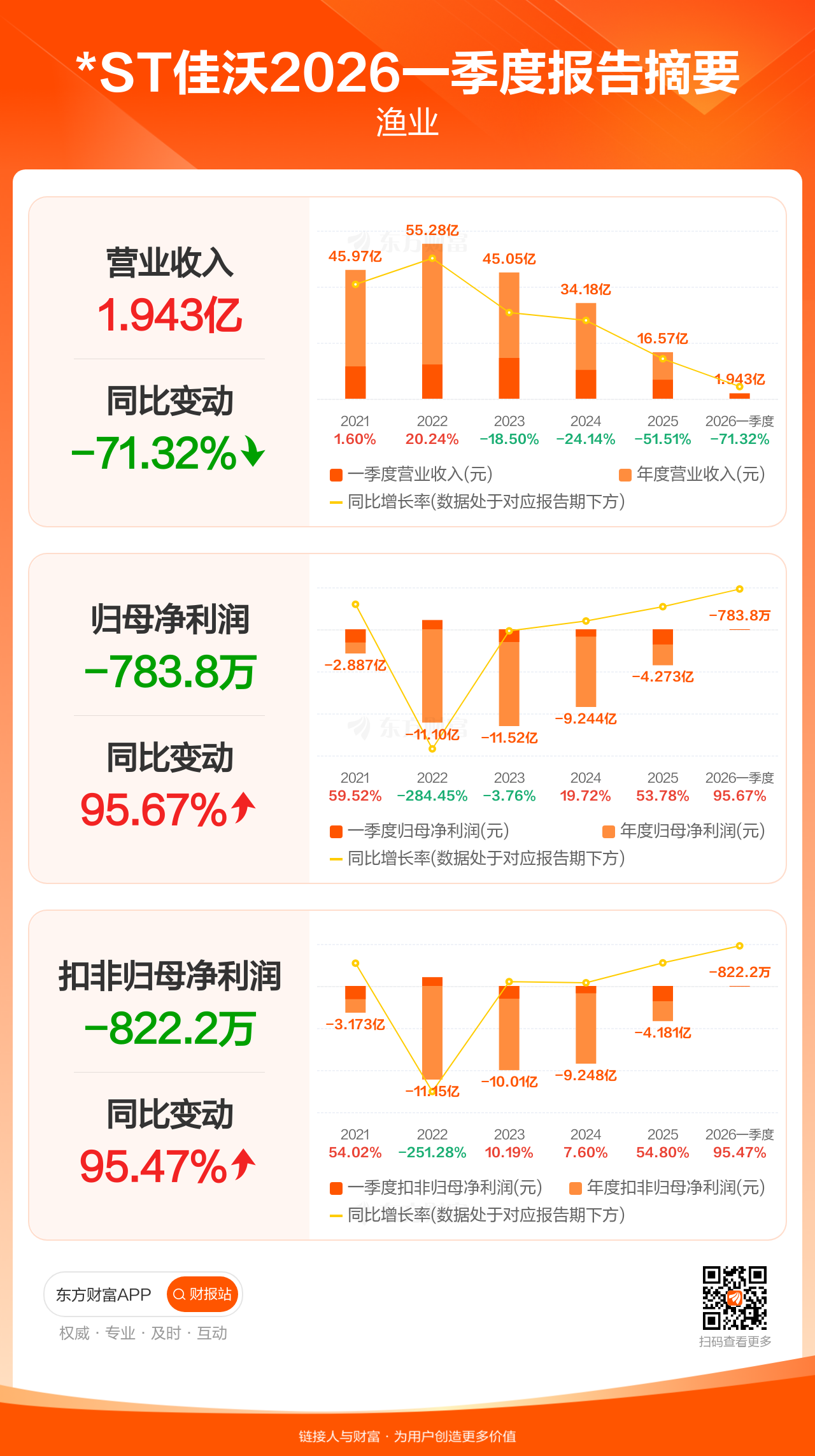 *ST佳沃4月25日发布2026年一季报显示,公司一季度实现营业收入1.94亿元,同比下滑71.32%;归母净利润-783.83万元;扣非归母净利润-822.21万元。
