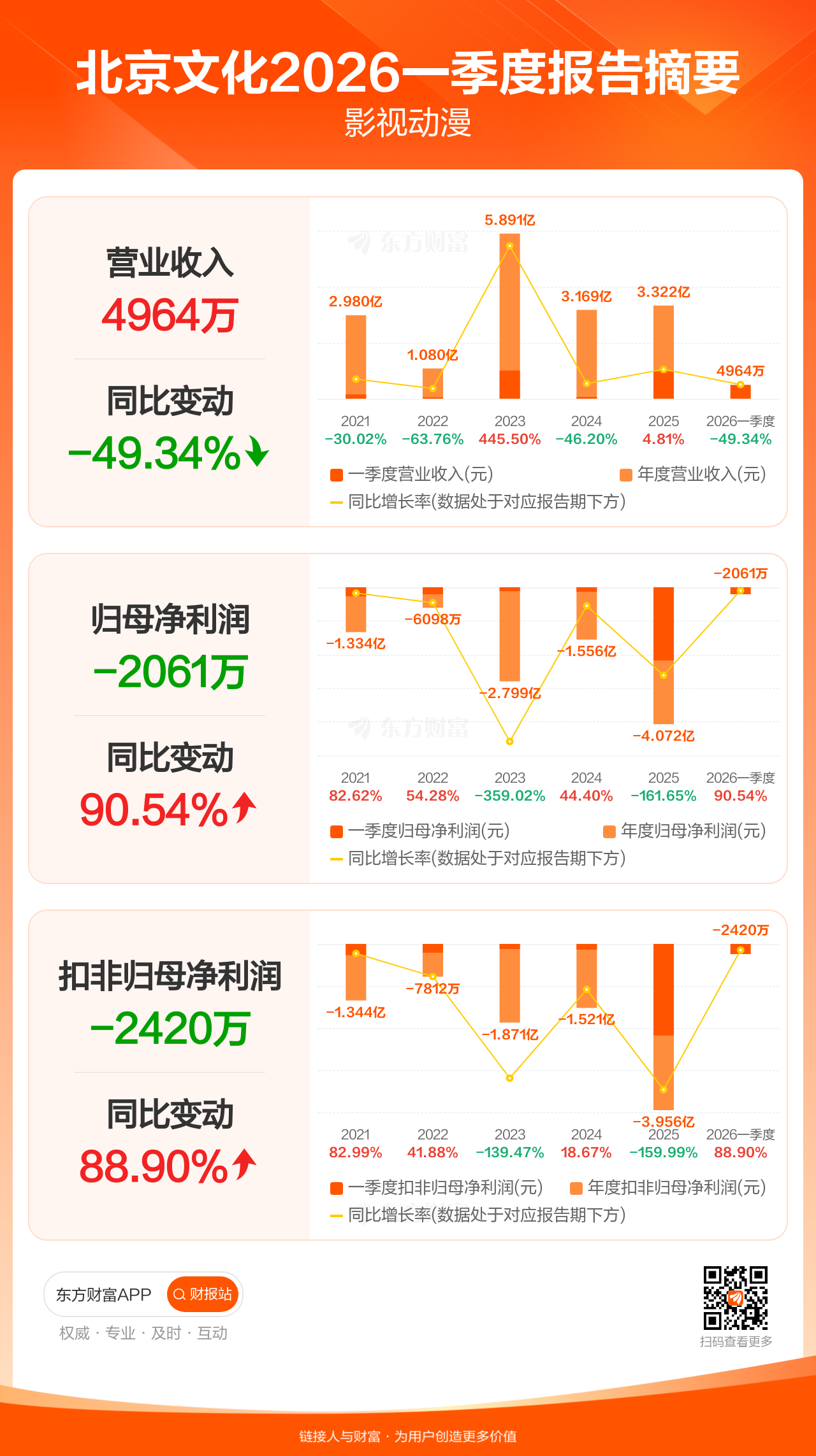 北京文化4月25日发布2026年一季报显示,公司一季度实现营业收入4963.79万元,同比下滑49.34%;归母净利润-2061.23万元;扣非归母净利润-2420.03万元。
