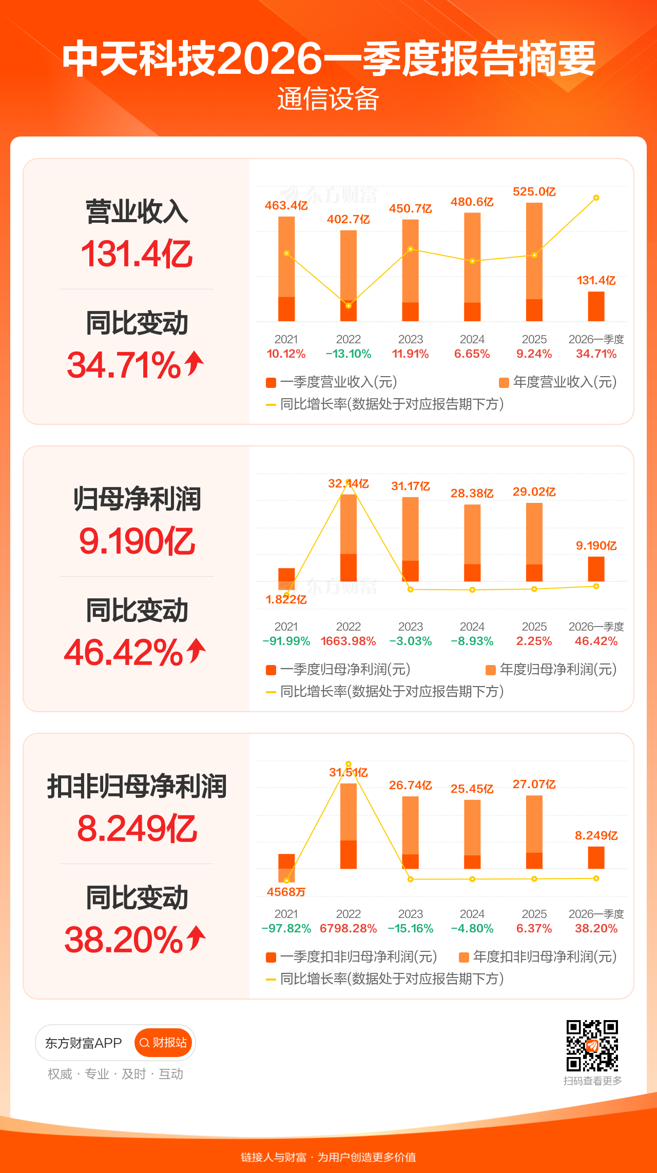 中天科技4月25日发布2026年一季报显示,公司一季度实现营业收入131.42亿元,同比增长34.71%;归母净利润9.19亿元,同比增长46.42%;扣非归母净利润8.25亿元,同比增长38.20%。