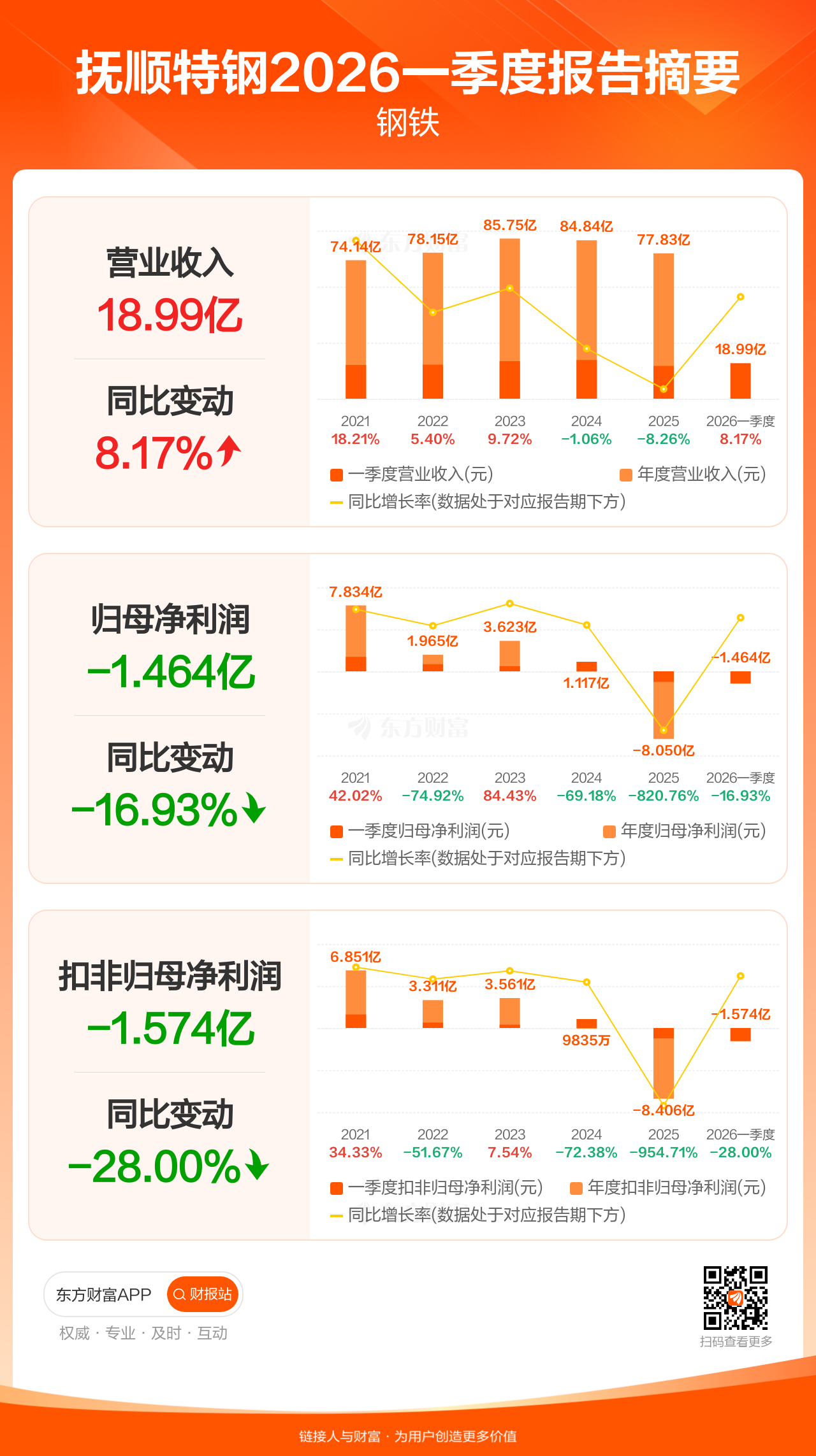 抚顺特钢4月25日发布2026年一季报显示,公司一季度实现营业收入18.99亿元,同比增长8.17%;归母净利润-1.46亿元;扣非归母净利润-1.57亿元。
