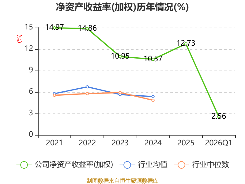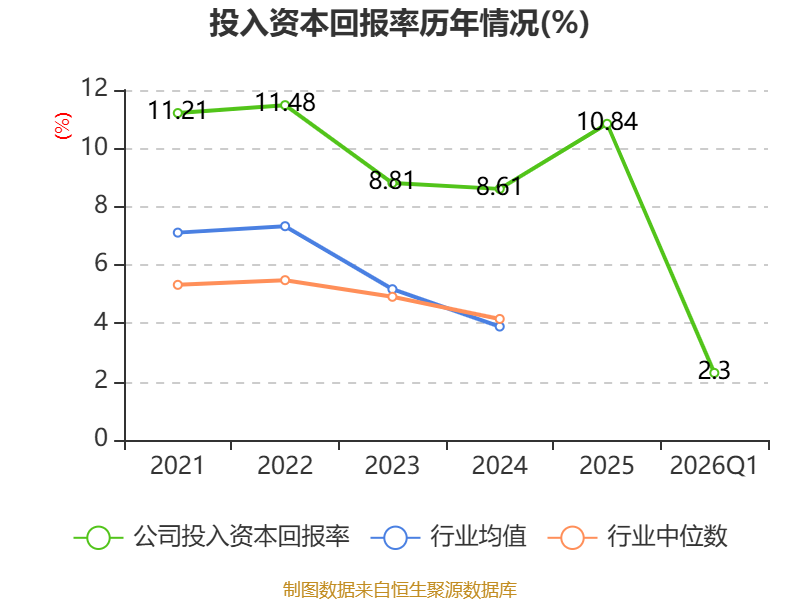 盈利能力方面, 2026年一季度公司加权平均净资产收益率为2.56%,同比上升0.46个百分点。公司2026年第一季度投入资本回报率为2.3%,较上年同期上升0.58个百分点。