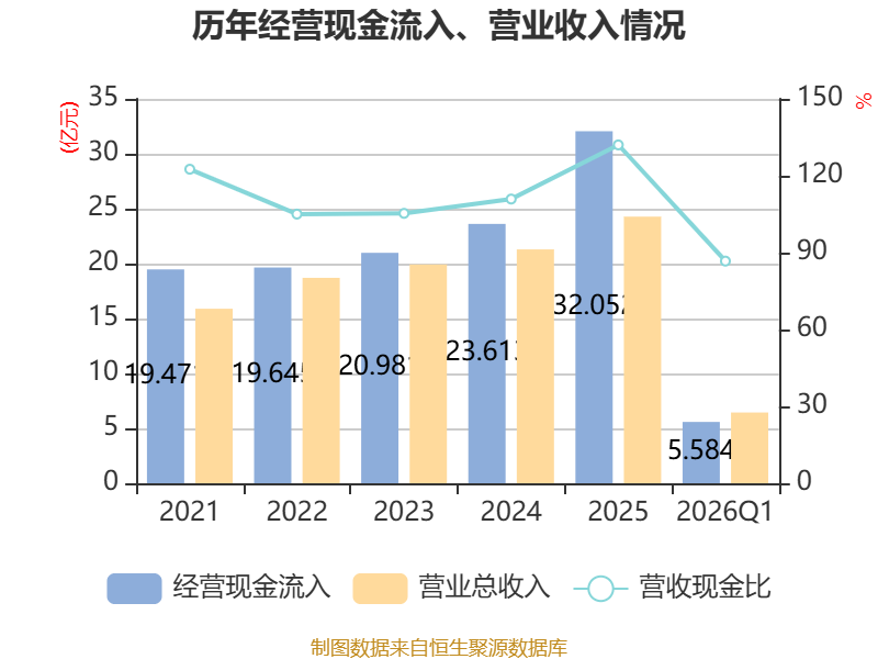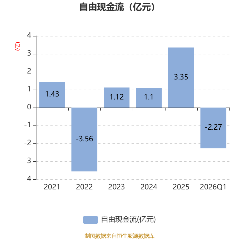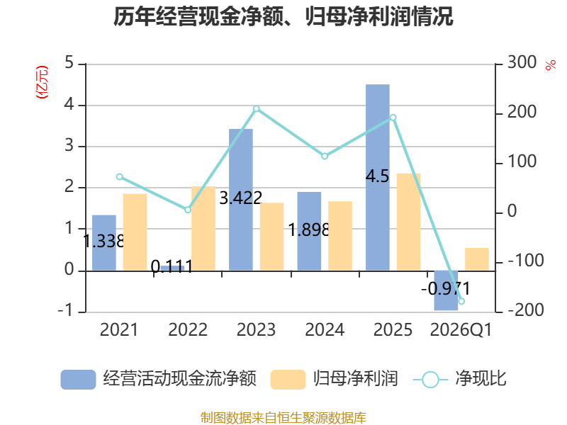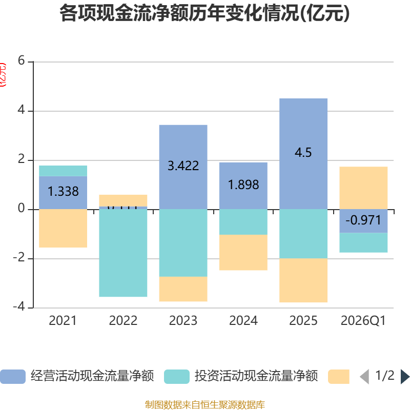 截至2026年一季度末,公司经营活动现金流净额为-9710.12万元,同比减少3.45亿元;筹资活动现金流净额1.72亿元,同比增加1.45亿元;投资活动现金流净额-7944.84万元,上年同期为-8567.45万元。
