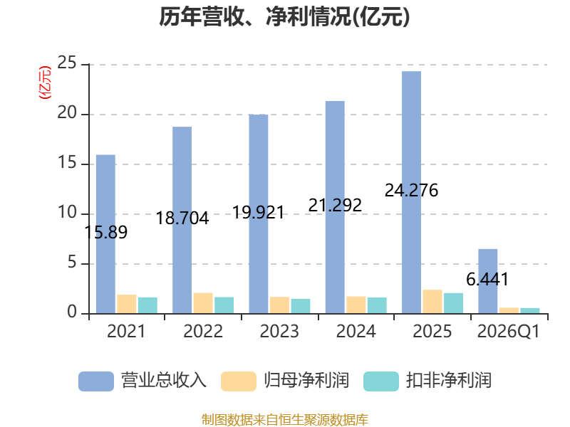 中证智能财讯法兰泰克(603966)4月25日披露2026年第一季度报告。公司实现营业总收入6.44亿元,同比增长57.92%;归母净利润5425.69万元,同比增长57.75%;扣非净利润5109.65万元,同比增长75.44%;经营活动产生的现金流量净额为-9710.12万元,上年同期为2.48亿元;报告期内,法兰泰克基本每股收益为0.1364元,加权平均净资产收益率为2.56%。