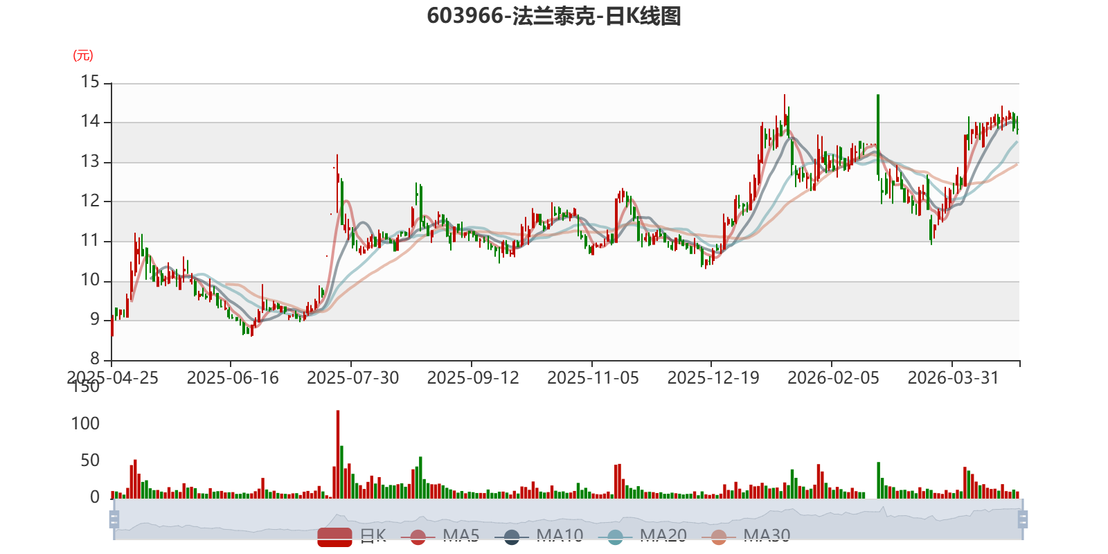 以4月24日收盘价计算,法兰泰克目前市盈率(TTM)约为21.67倍,市净率(LF)约2.6倍,市销率(TTM)约2.07倍。