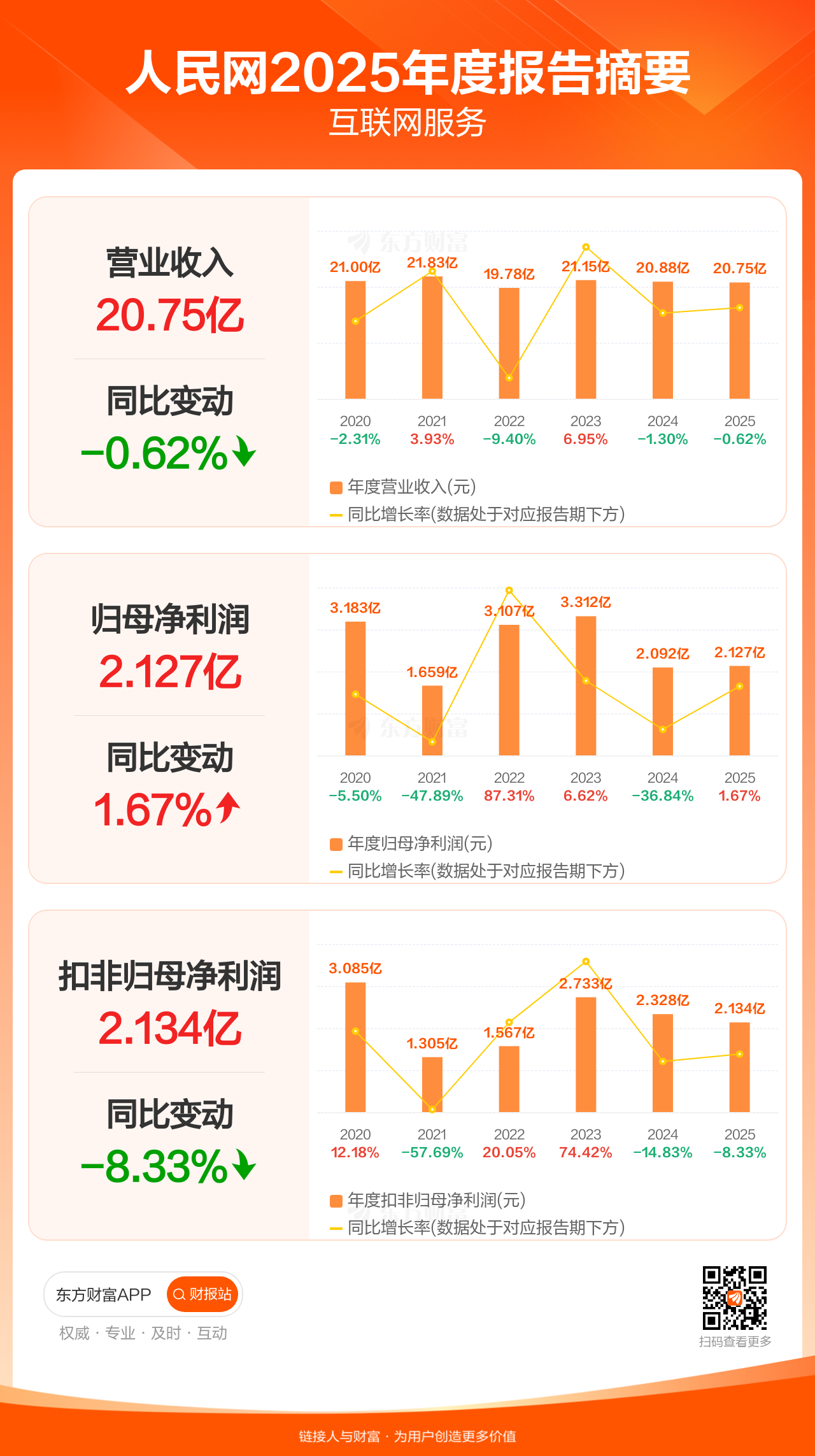 人民网4月25日发布2025年年报显示,公司全年实现营业收入20.75亿元,同比下滑0.62%;归母净利润2.13亿元,同比增长1.67%;扣非归母净利润2.13亿元,同比下滑8.33%。