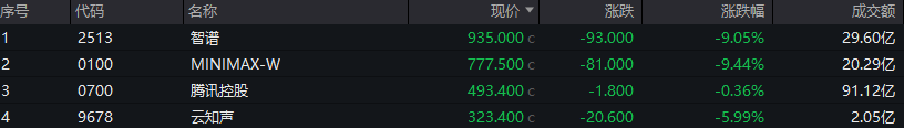 AI大模型股下跌,智谱跌9%,MINIMAX跌超9%。