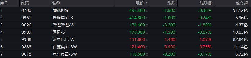 权重科技股表现分化,阿里巴巴涨1%,百度涨近1%,美团跌近1%。