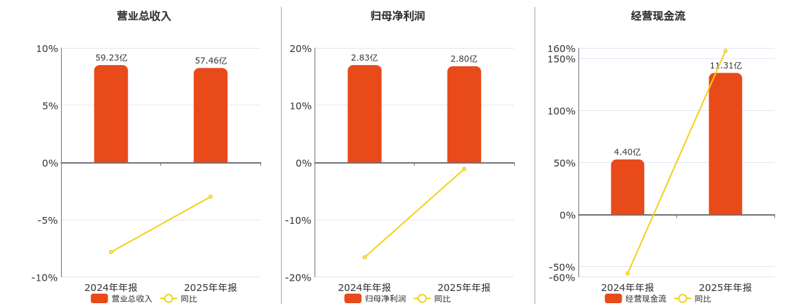 公司营业总收入为57.46亿元,较去年同报告期营业总收入减少1.77亿元,同比较去年同期下降2.99%。归母净利润为2.80亿元,较去年同报告期归母净利润减少322.93万元,同比较去年同期下降1.14%。经营活动现金净流入为11.31亿元。