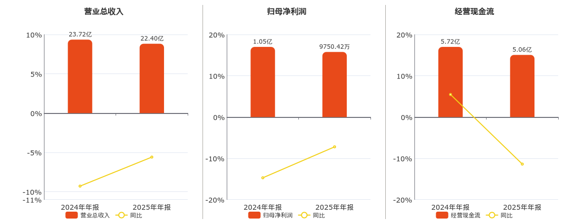 公司营业总收入为22.40亿元,较去年同报告期营业总收入减少1.33亿元,同比较去年同期下降5.59%。归母净利润为9750.42万元,在已披露的同业公司中排名第111,较去年同报告期归母净利润减少757.22万元,同比较去年同期下降7.21%。经营活动现金净流入为5.06亿元,较去年同报告期经营活动现金净流入减少6511.35万元,同比较去年同期下降11.39%。